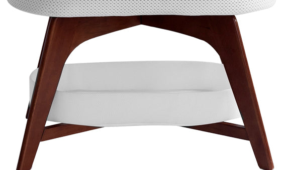 - Premium-structured fabric sleeping area with solid wood base in walnut, white or mint finish.