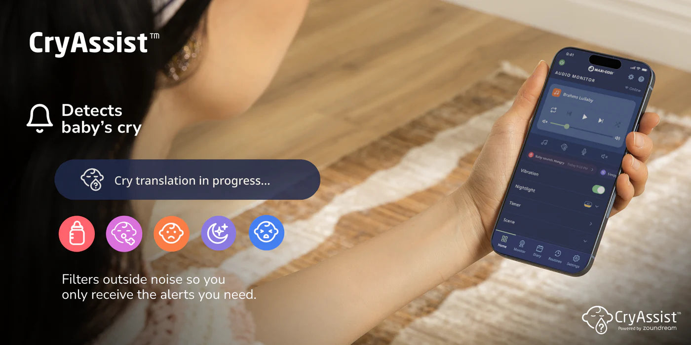The included Maxi-Cosi Audio Monitor features CryAssist, powered by Zoundream. Our groundbreaking CryAssist technology uses AI to translate your little one’s cries, letting you know if they might be sleepy, fussy, gassy, agitated, or hungry. Other baby monitors just detect a child’s cries, but by knowing what is bothering your baby, you’ll be able to respond to their needs quickly and with confidence. Your little one is communicating with you, and with CryAssist, now you’ll know what they’re saying. Each of CryAssist’s response-based features are optional, ensuring control is always in your hands. With cries and cry data kept anonymous and encrypted on our cloud, private moments are kept between you and baby.