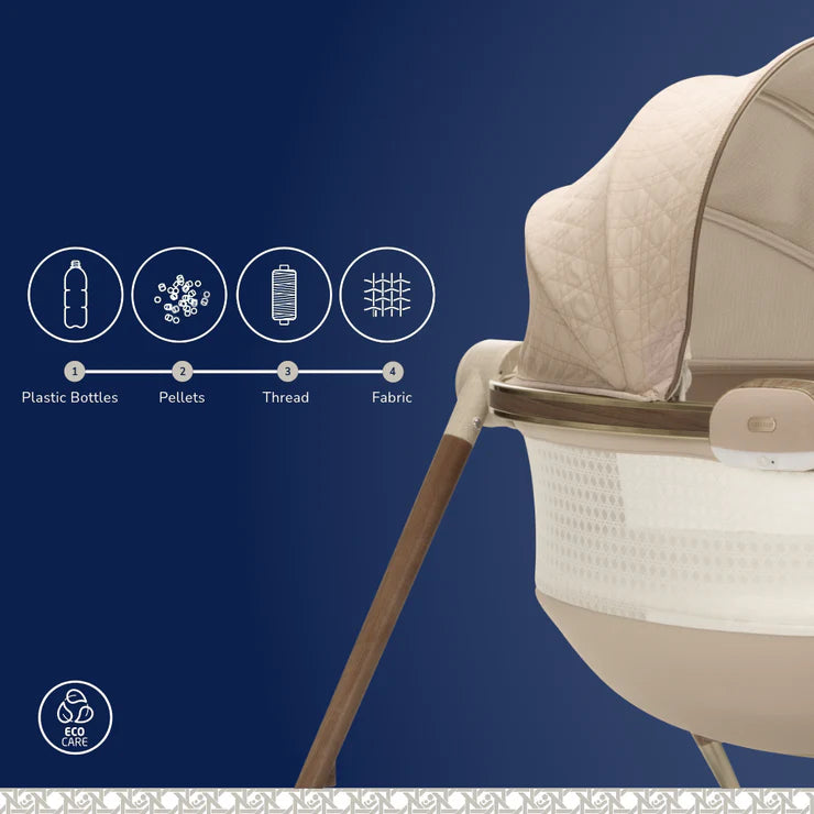 The Sibia Bassinet combines timeless design with modern technology, featuring premium materials, EcoCare fabric, and AI-powered CryAssist technology that helps parents understand their baby’s needs. It also includes an adjustable half-canopy, Bluetooth-enabled baby monitor, and gentle vibration settings for added comfort.
