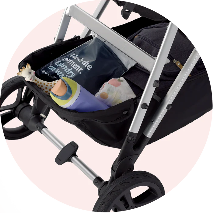 Our XL stroller basket supports up to 25 lbs, allowing you to carry all your essentials, and those "just in case" extras. Inside, an enclosed pocket keeps valuables secure, while a seatback pocket ensures your phone is always within easy reach during your strolls.