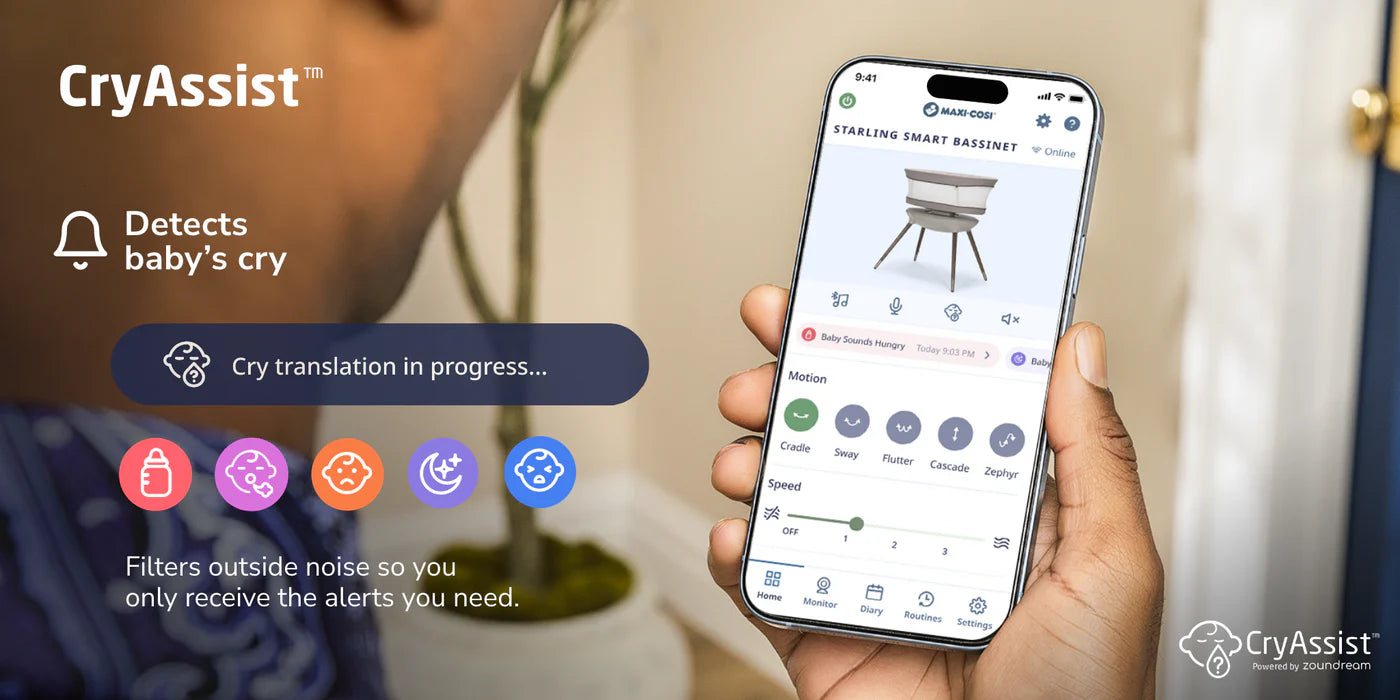 Powered by Zoundream, our groundbreaking CryAssist technology uses AI to translate your little one’s cries, letting you know if they might be sleepy, fussy, gassy, agitated, or hungry; and by knowing what is bothering your baby, you’ll be able to respond to their needs quickly and with confidence. Your little one is communicating with you, and with CryAssist, now you’ll know what they’re saying. Each of CryAssist’s response-based features are optional, ensuring control is always in your hands. With cries and cry data kept anonymous and encrypted on our cloud, private moments are kept between you and baby.